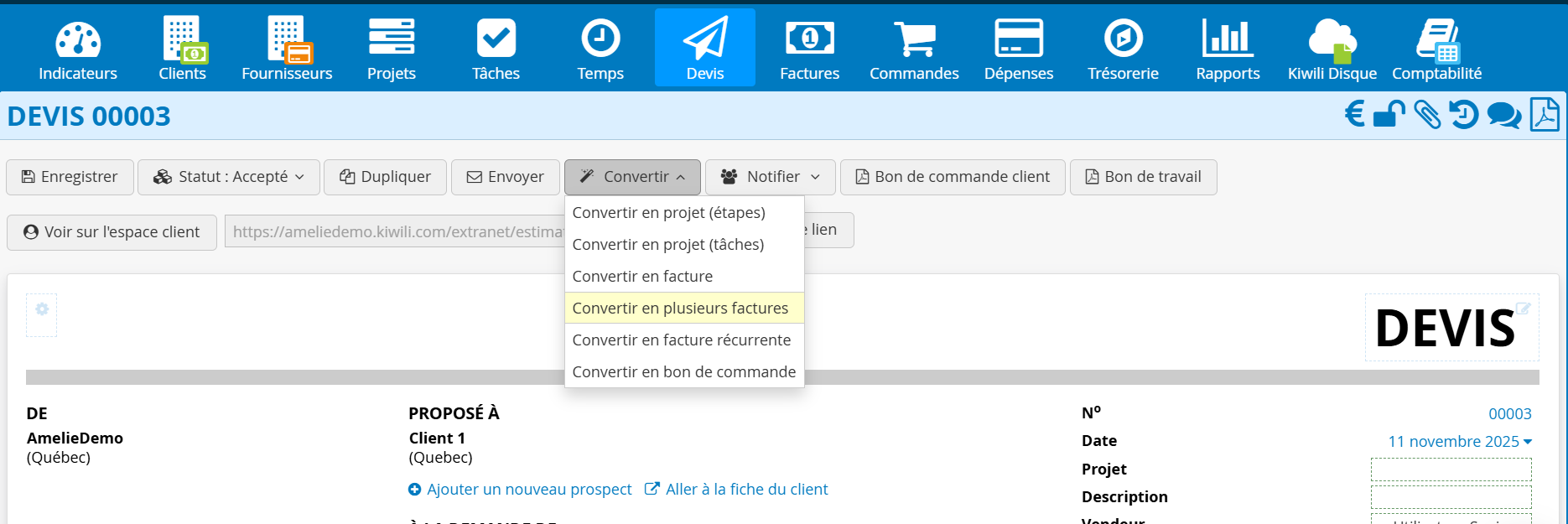 Convertissez vos soumissions en une ou plusieurs factures en un clic.