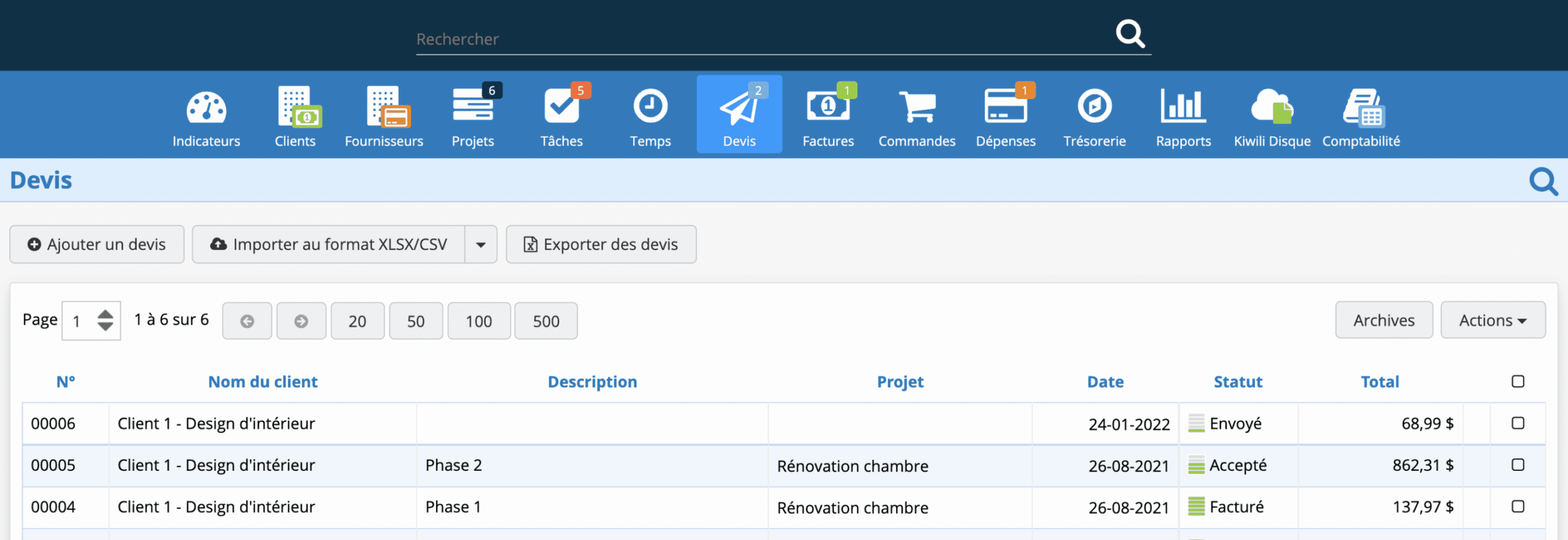 Grâce au logiciel de création de devis Kiwili, vous avez déjà un modèle de soumission. Sur votre devis, il vous suffit de choisir les informations présentes dans votre Kiwili (client, date, projet, services ou produits, quantité ..) pour le remplir et le personnaliser aux couleurs de votre entreprise. Ensuite il ne vous reste plus qu’à envoyer votre proposition commerciale à votre prospect.