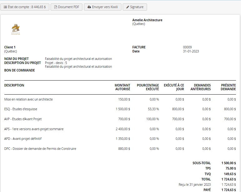 Facturez vos projets étape par étape, en suivant précisément l’avancement réel des travaux. Paramétrez des factures progressives (pourcentages, montants, jalons) et générez vos factures en quelques clics.