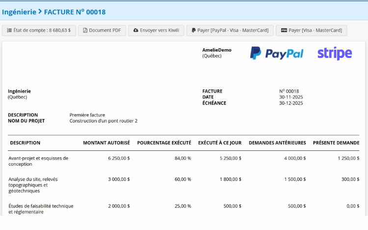 Notre solution optimise votre facturation grâce à des factures professionnelles et claires. Vous pouvez proposer différents modes de paiement (dont PayPal et Stripe) à vos clients pour accélérer la réception de vos revenus, où que vous soyez.